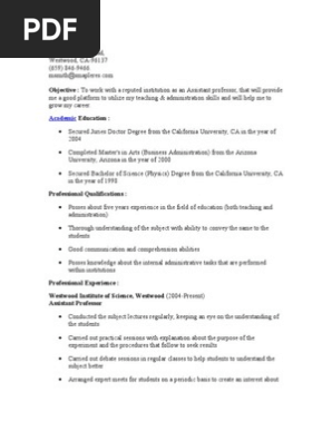 Sample resume for assistant professor fresher pdf. Due to the advanced education needed for this degree most in the field are extremely passionate about their subject matter. Researched study materials per syllabus requirement. Business is a super competitive field and your resume should show that you are up to game.